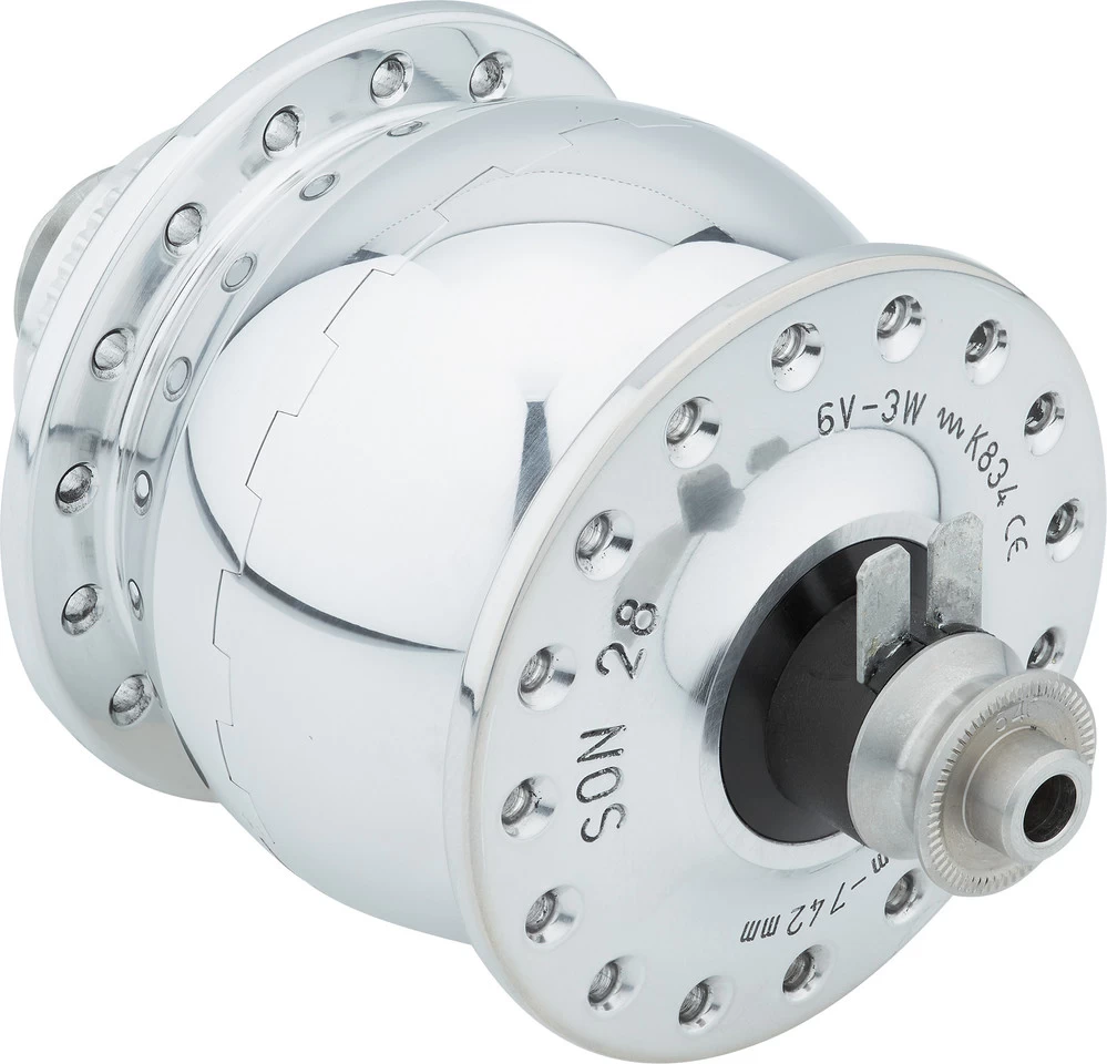 Der Son 28 ist ein universell für alle Laufradgrößen von 16″ bis 29″ zugelassener Nabendynamo. Die Nennleistung erreicht er im 28″ -Rad bei ca. 16 km/h. Damit ist er zu empfehlen, wenn bei langsamer Fahrt besonders viel Licht benötigt wird oder andere Geräte betrieben bzw. deren Akkus geladen werden sollen. Im Vergleich zum Vorgänger Son klassik konnten die Leerlaufverluste um ca. 15 % und das Gewicht um 140 g verringert werden.