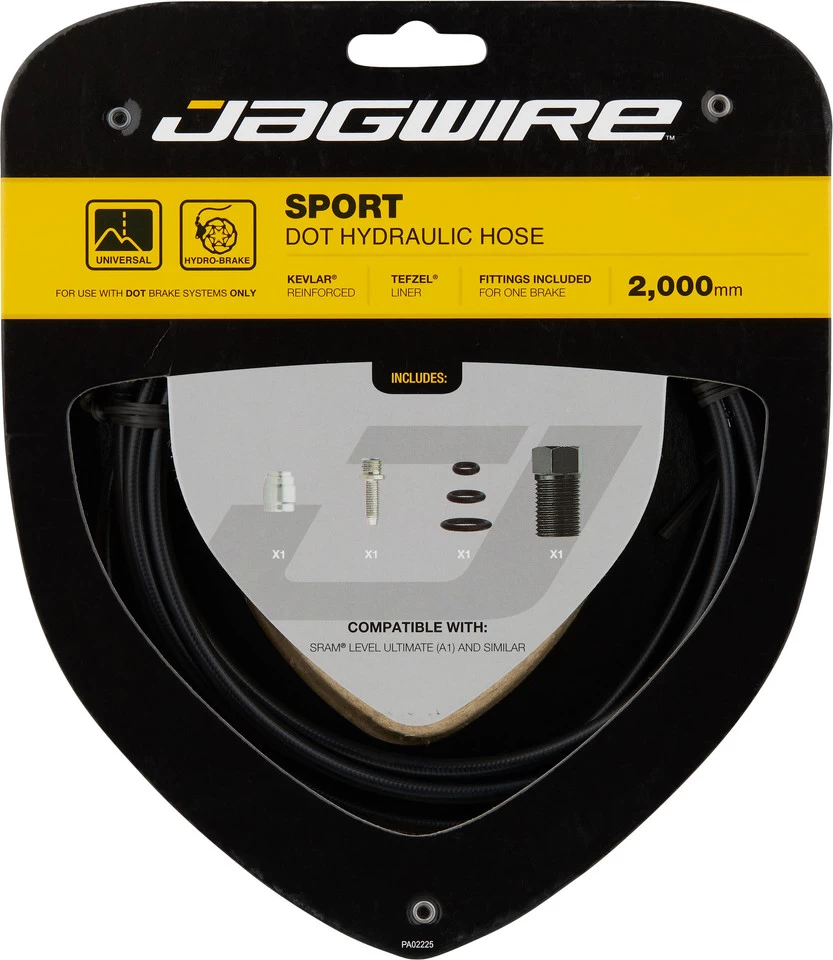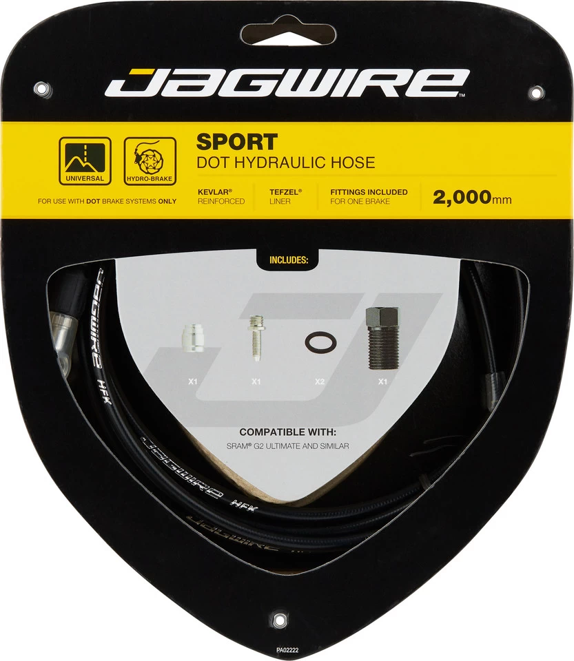 Diese Sport Hydraulic Bremsleitung von Jagwire eignet sich ausschließlich für Scheibenbremssysteme auf DOT-Basis. Sie wird mit Bremsgriff- und Bremssattel-Anschlussstücken geliefert, die sie je nach Version kompatibel mit verschiedenen Bremsen von SRAM und Avid machen.