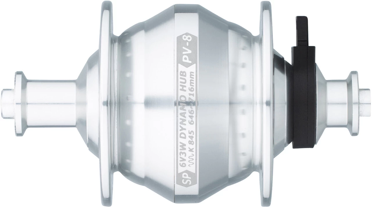 Die P-Serie Dynamos sind nicht nur leistungsstark, sondern auch effizient, sie bieten einen unerreichten Wirkungsgrad von 72 % bei 15 km/h. Das Nabengehäuse des PV-8 wirkt minimalistisch, der konstruktive Aufwand im Inneren ist das exakte Gegenteil. Jedem noch so kleinen Detail wurde große Aufmerksamkeit geschenkt, um ein perfektes Ergebnis zu erzielen. Der geschmeidige ovale Nabenkörper bietet eine ideale Balance aus geringem Gewicht und überragender Festigkeit. Eine große Auswahl an Farben und verschiedene Lochzahlen ermöglichen es für jedes Rad den stylisch passenden Nabendynamo zu finden.