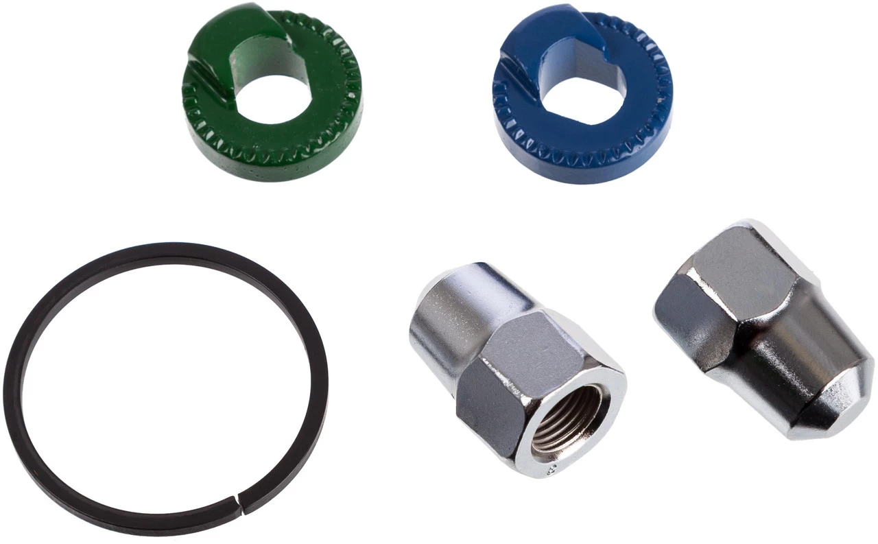 Die Shimano Alfine Di2 Kleinteile SM-S705 für vertikale Ausfallenden eignen sich für Alfine Di2 Getriebenaben mit der Schaltmotoreinheit MU-S705. Sie lassen sich für Rahmen mit senkrechten Ausfallenden mit einem Winkel von 60° bis 90° verwenden (8R/8L). Das Set besteht aus farbigen Sicherungsscheiben und Hutmuttern.